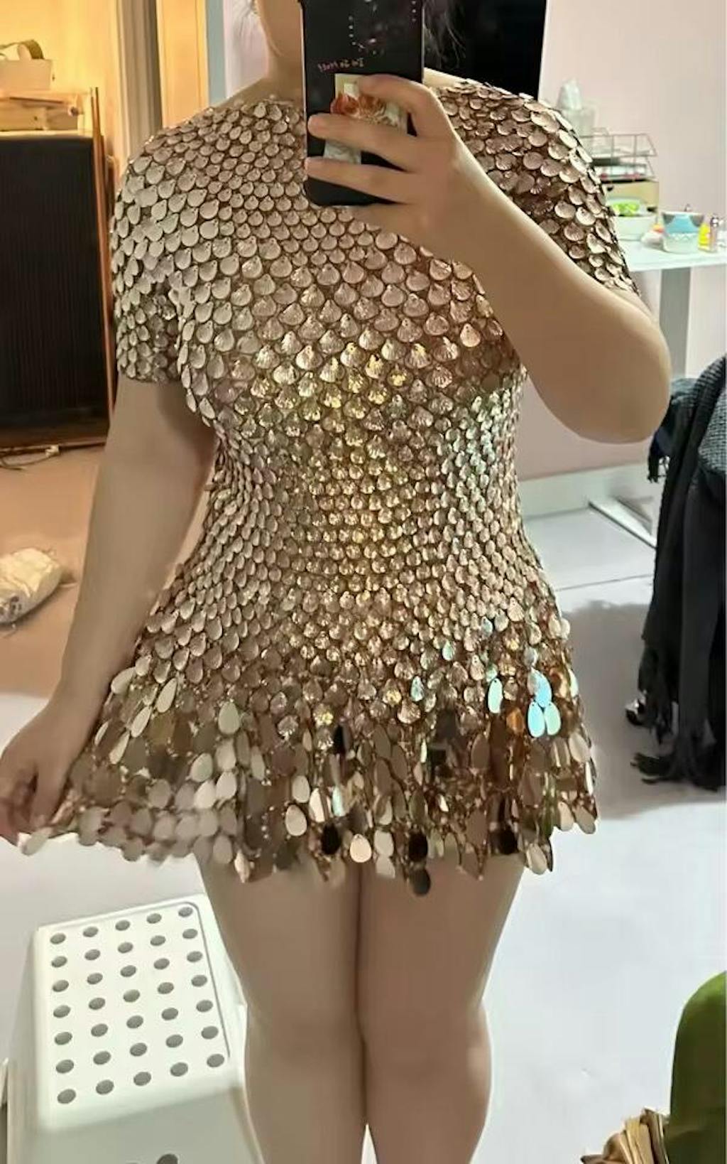 A statement piece designed to captivate. Adorned with hand-glued metallic sequins, this dress shimmers with every movement, creating a radiant, liquid-like glow.