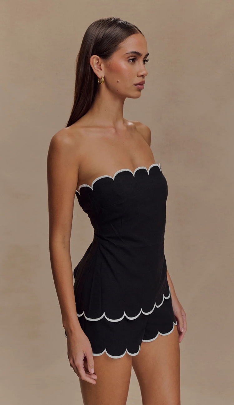 A modern take on feminine tailoring, the Axelle Scallop Set pairs clean structure with soft detailing. The strapless longline top features a scalloped neckline and hem, highlighted by contrast stitching for a refined touch. Designed for ease and elegance, it’s finished with a straight elasticated back. Style with the matching scallop shorts for an effortlessly chic look.