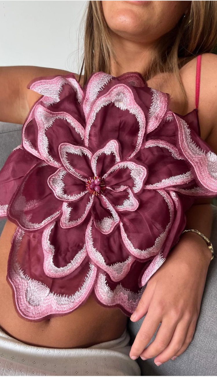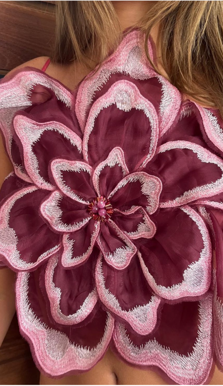 Cassia presenta un diseño de bordado minorista hecho a mano, detalles de cuentas en forma de corazón de flores, diseño de espalda abierta con diseño de tiras finas y broche en el medio, cobertura completa en el busto delantero.