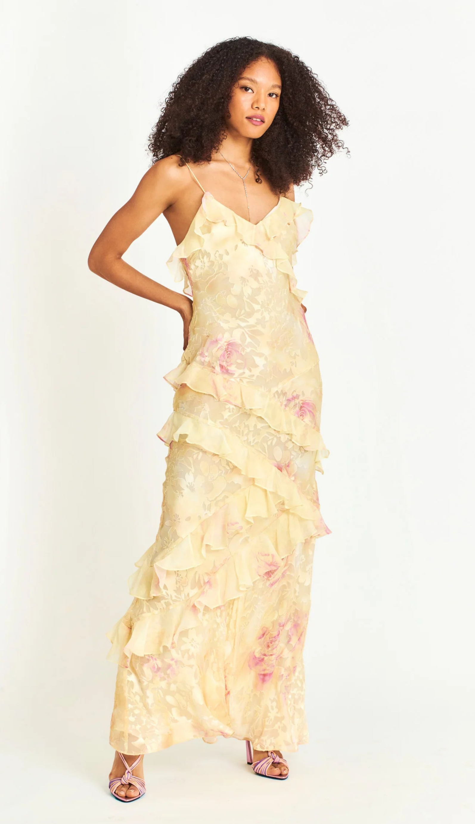 Dannae es delicada, femenina y todo menos ordinaria. Presenta un tejido con estampado floral semitransparente, diseño sin espalda, tirantes finos ajustables, volante fruncido por toda la prenda y un largo maxi. Totalmente forrado.