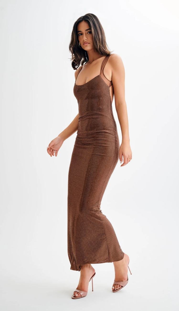 Enchanting, bold and feminine. Made of a scratch mesh shimmering chocolate applique fabric, Diane features a scoop neckline, medium mesh straps extended into back panels, back button and keyhole closure and an open back detailing.