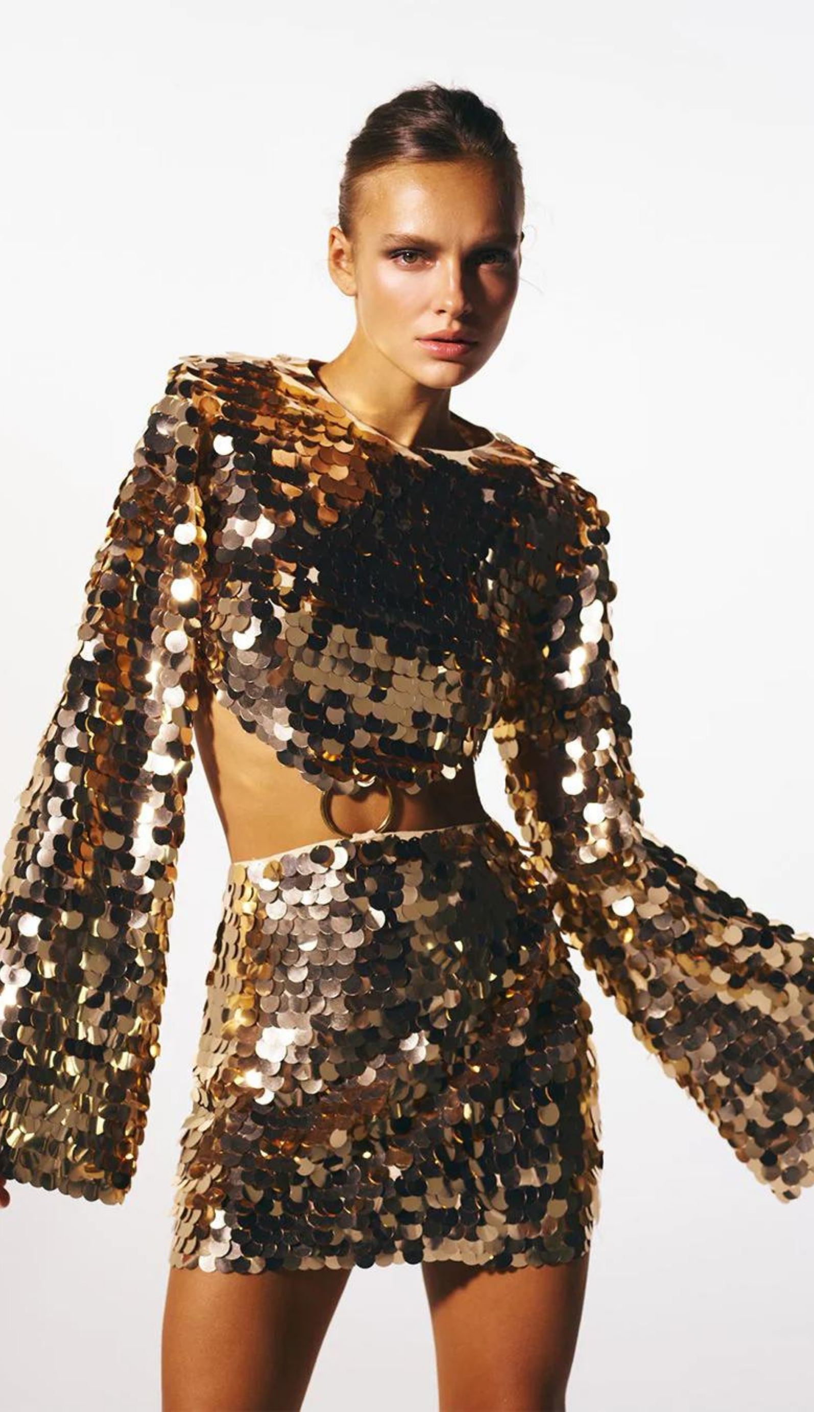Eliza es la acompañante perfecta para tus próximas fiestas navideñas. Presenta una elegante silueta en forma de A con mangas largas tipo farol y una espalda abierta para un look espectacular. El escote redondo está acentuado con un detalle de aro en forma de O, que te da un brillo dorado.