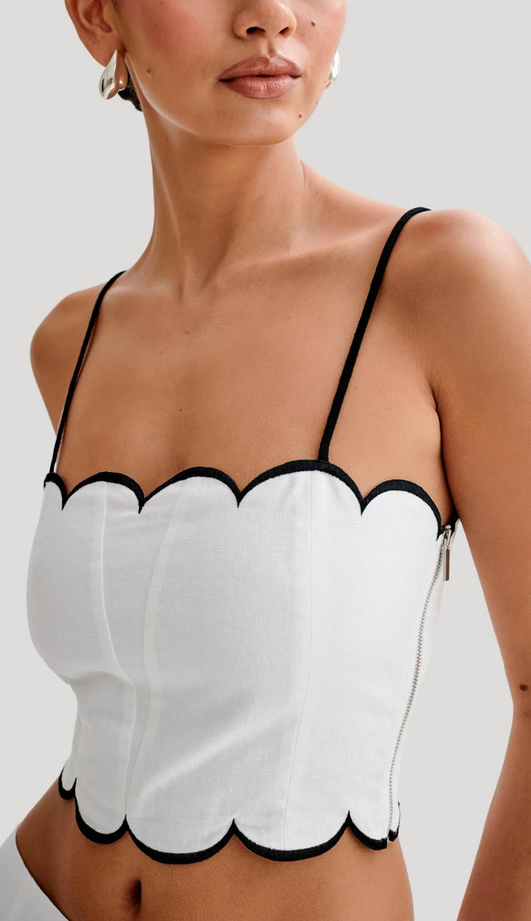Kayleigh blends femininty, classic and timeless design in one co-ord. Featuring a square neckline top, scalloped detailing and hem adds, side zipper and adjustable straps paired up with an A-line maxi skirt.