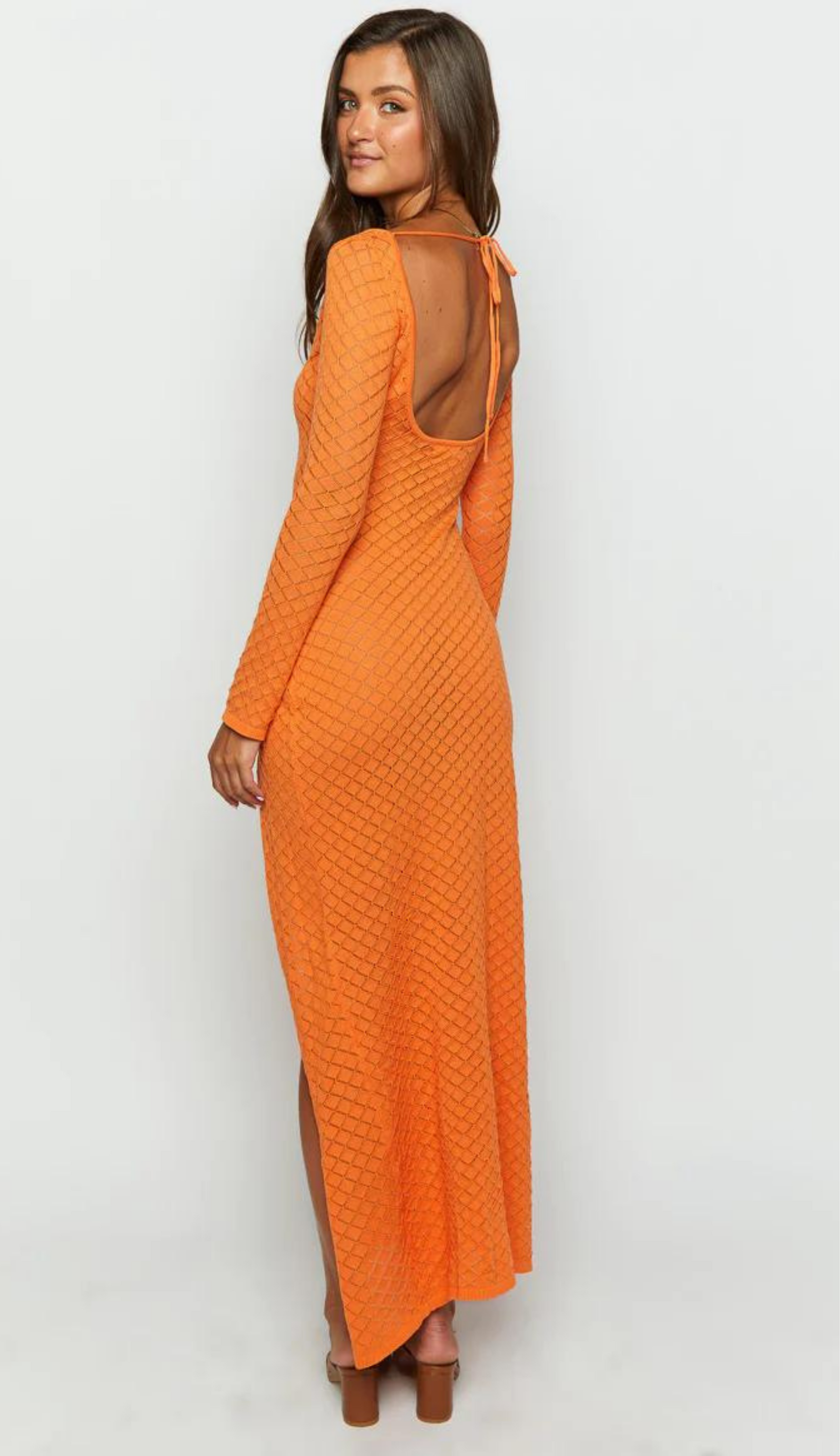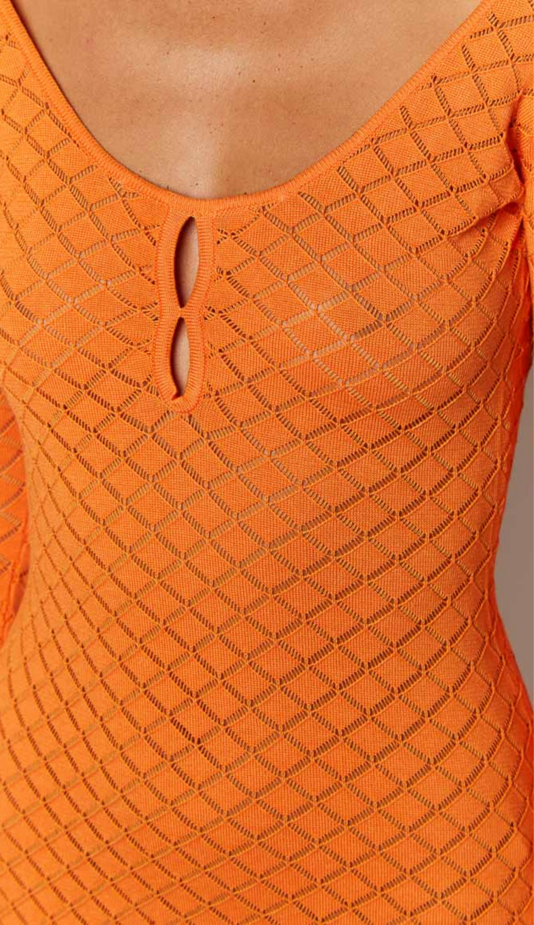 Sabo es el vestido ideal para pasar el día y la noche durante el verano, confeccionado en tejido de crochet de peso medio en un rico tono mandarina, sin forro, mangas largas, escote en V, largo maxi con un corte en el medio para acentuar ligeramente el busto.