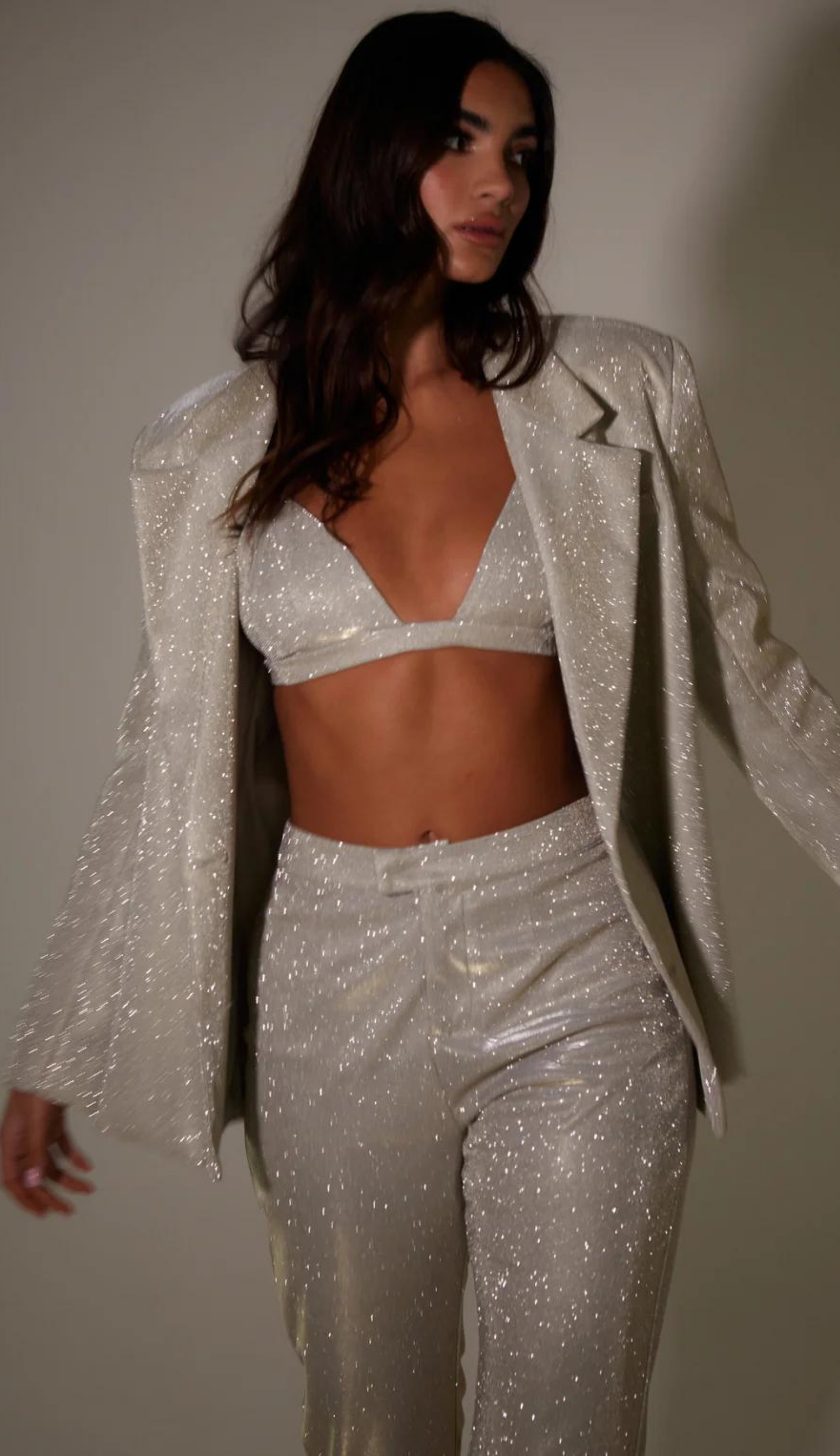 High rise pant with invisible zipper detail, adjustable bralette style top. Oversized blazer with shoulder detailing, buttons, lower pockets.