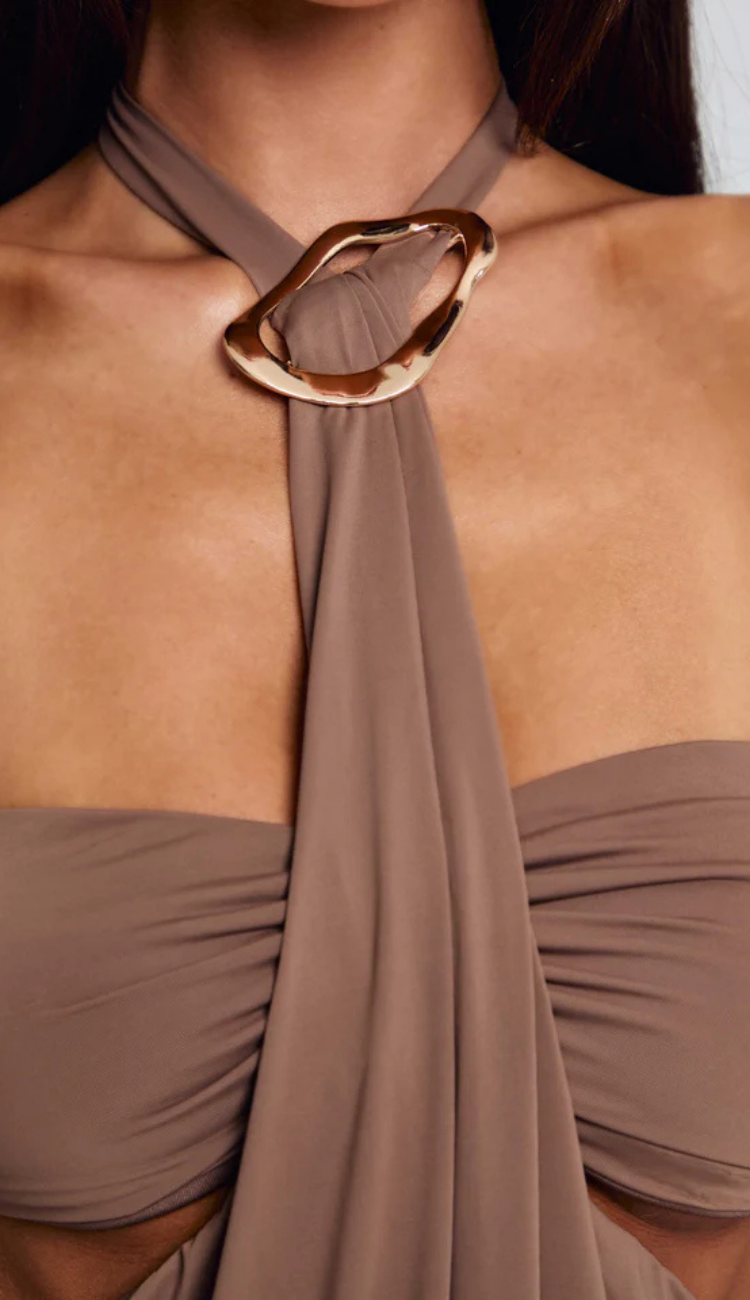 A statement in slinky sophistication. Sora features a ruched bodycon skirt that sculpts and defines, paired with a softly draped bodice for effortless balance. Finished with luxe gold hardware and a tie neckline, this mini is designed for after-dark impact with minimal effort.