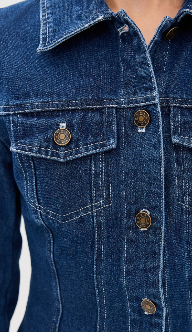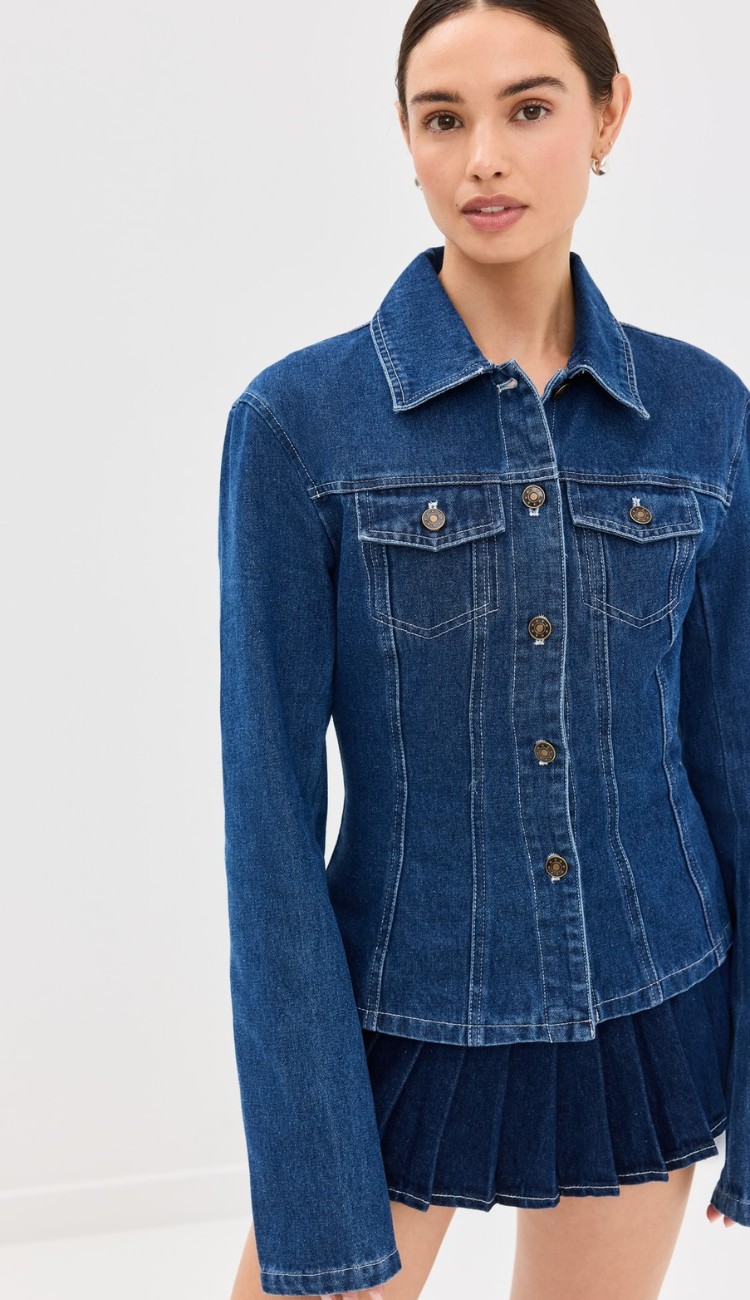 Chic and structured, the Valentina Denim Set redefines classic denim with a modern edge. Featuring a fitted button-up jacket with tailored seams for a sculpted silhouette, this set is paired with a mini-length plissé skirt, adding movement and texture. Perfect for day-to-night styling, effortlessly blending sophistication with a playful twist.