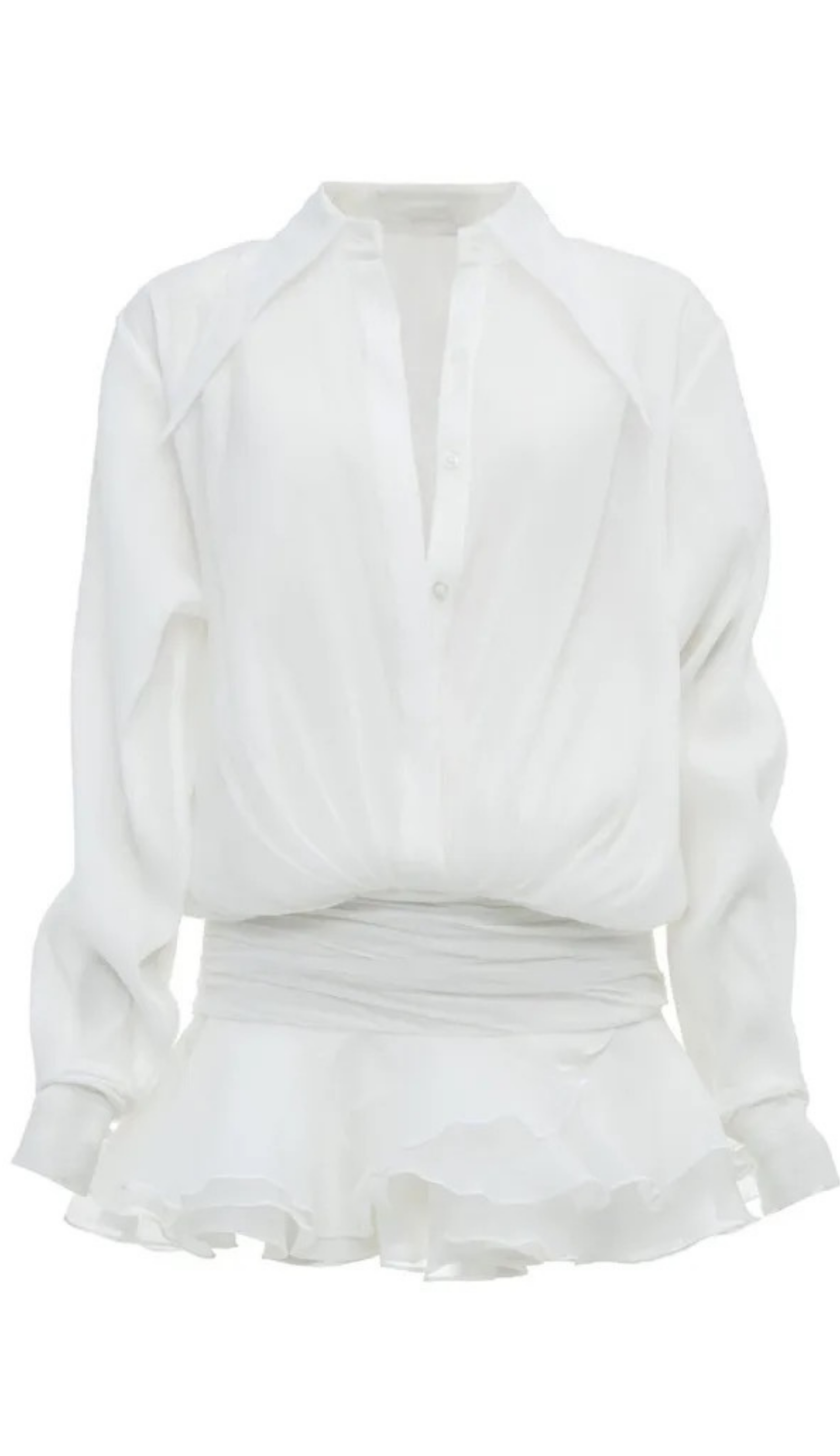 Mika presenta una silueta relajada y suelta, cintura baja ceñida, diseño de camisa, detalle de botones, mangas largas, falda fruncida con volados. Totalmente forrado.