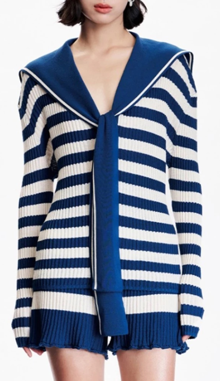 Regular long sleeve fitted style blouse, V-neck with fabric drape details, straight cut skirt with small ruching details. Printed horizontal stripes.