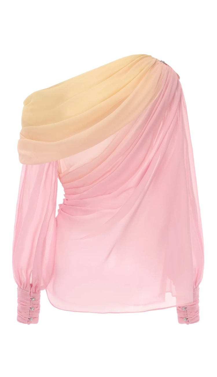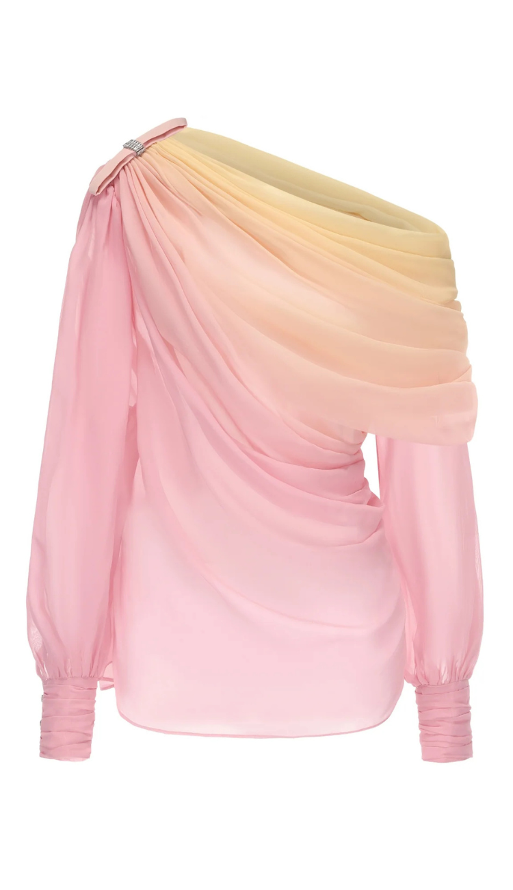 Where sunset skies meet couture detail. The Aylin Top is a vision of ethereal romance, crafted in airy chiffon that fades from golden yellow to blush pink in a soft, fluid gradient. Its off-shoulder neckline exudes effortless femininity.