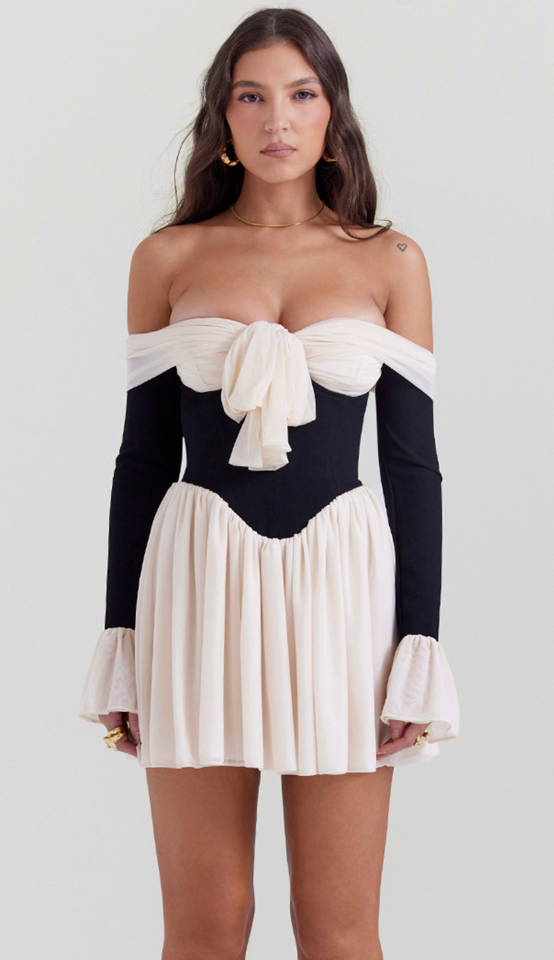 Azaria is classic, feminine and anything but ordinary. Features an elegant off shoulder neckline, underwire cups and an oversized bow to showcase the corseted bodice, long fluted sleeves, skirt gathered, back zip.