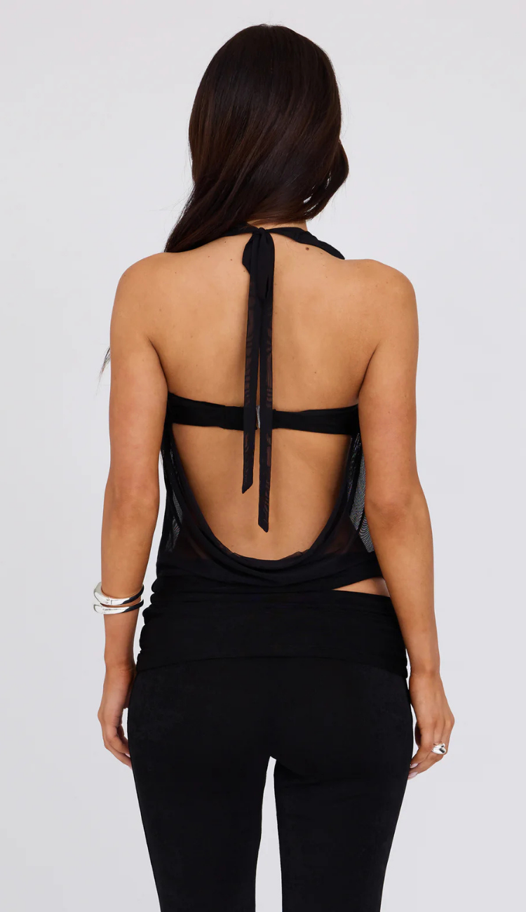 The Becca is a two-piece set designed for layered allure. Featuring a sheer mesh halter top with a draped cowl neckline, tie-back closure, and a relaxed, longline silhouette, it pairs seamlessly with the matching strapless bra for a complete look. The bra is crafted in a sheen knit with a gold buckle detail at the center front, clear gel tape along the edge for secure wear, and a hook-and-eye closure at the back.