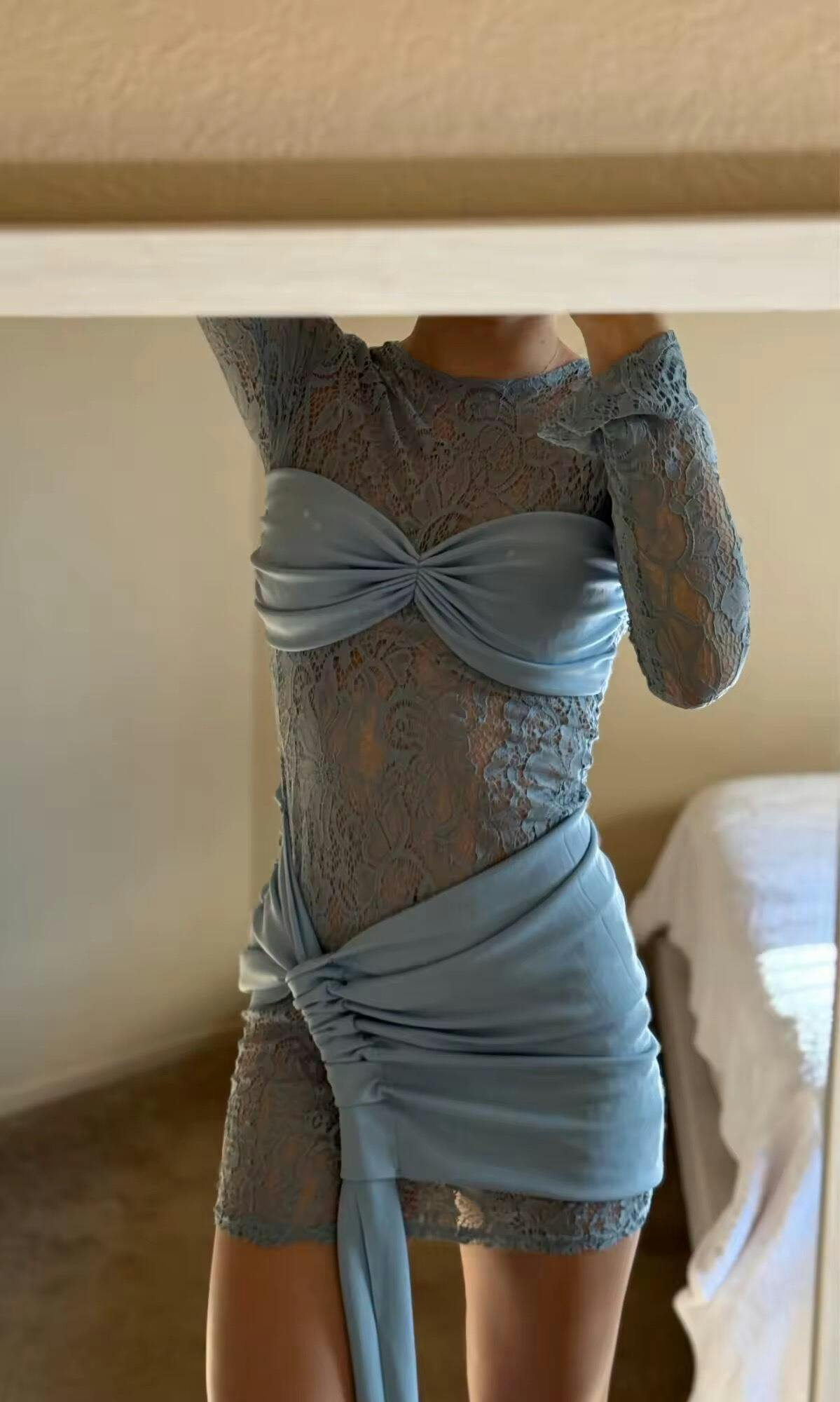 Designed for the modern muse, BRANDY embodies sophistication with its delicate lace fabrication and soft sky-blue hue. The figure-hugging silhouette accentuates your curves, while the sheer lace sleeves and ruched detailing add a playful touch of allure.