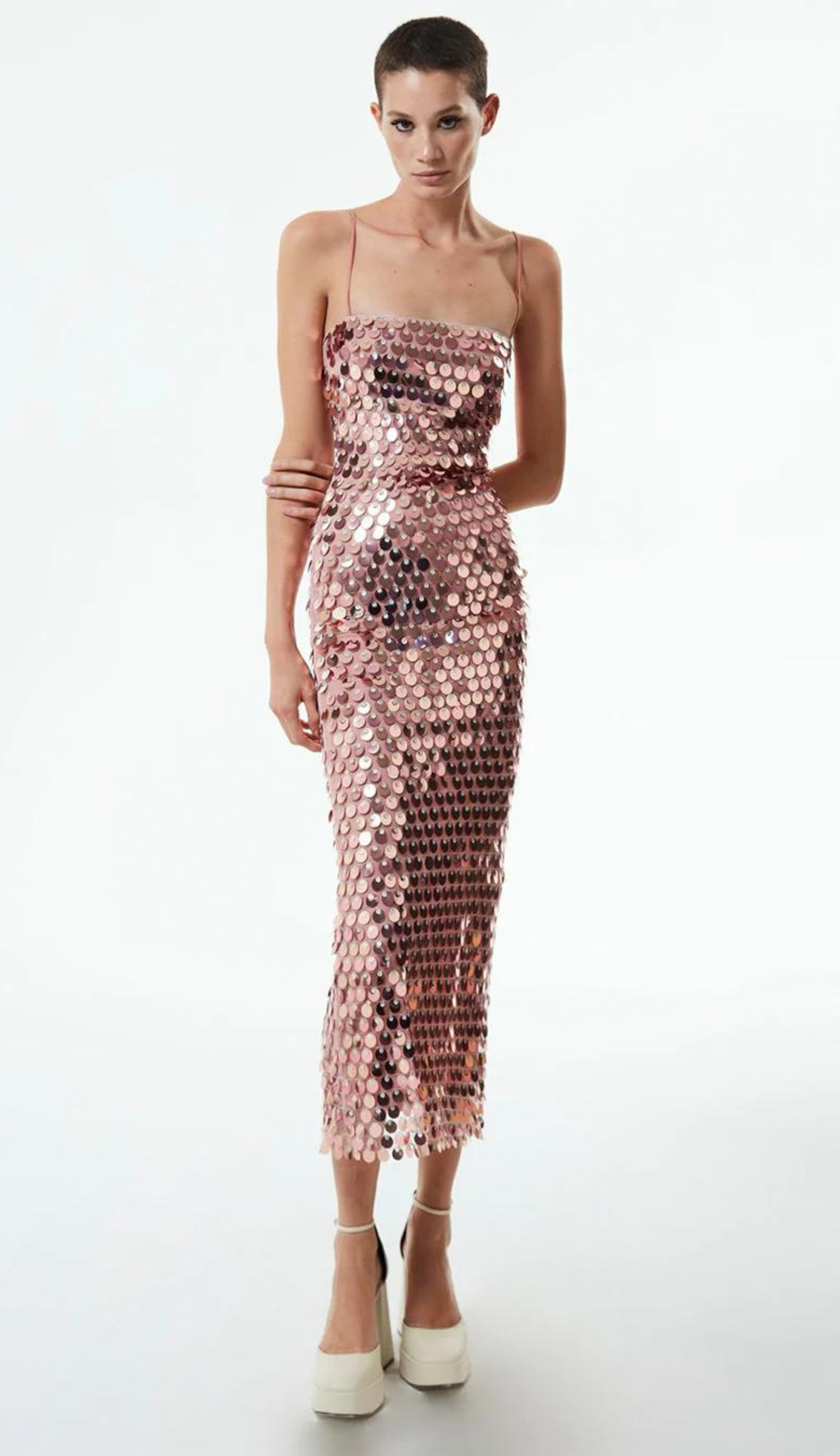 Featuring cotton material, black inner lining, baby pink embroidered sequins, square neckline, sleeveless and spaghetti straps, A-line cut, hidden zipper closure, fully lined.