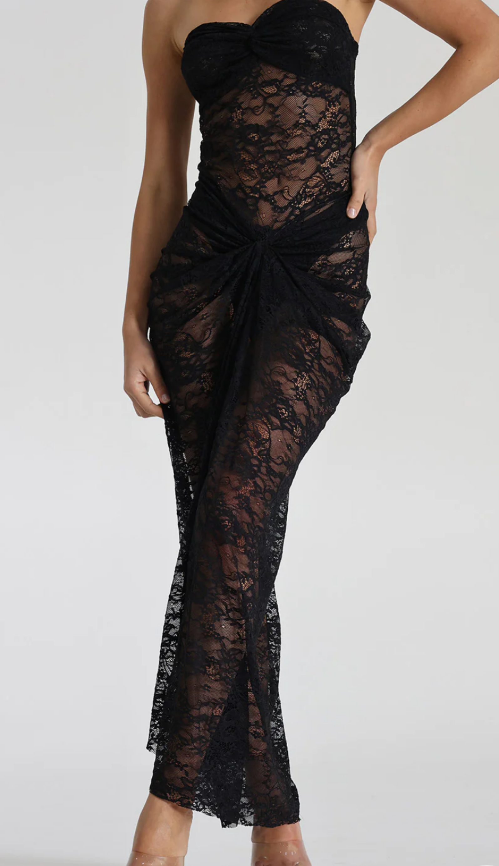 Step out in fun with Franka. Made of classic vintage inspired lace with asymmetrical front ties, heart shaped neckline, sleeveless and see through.