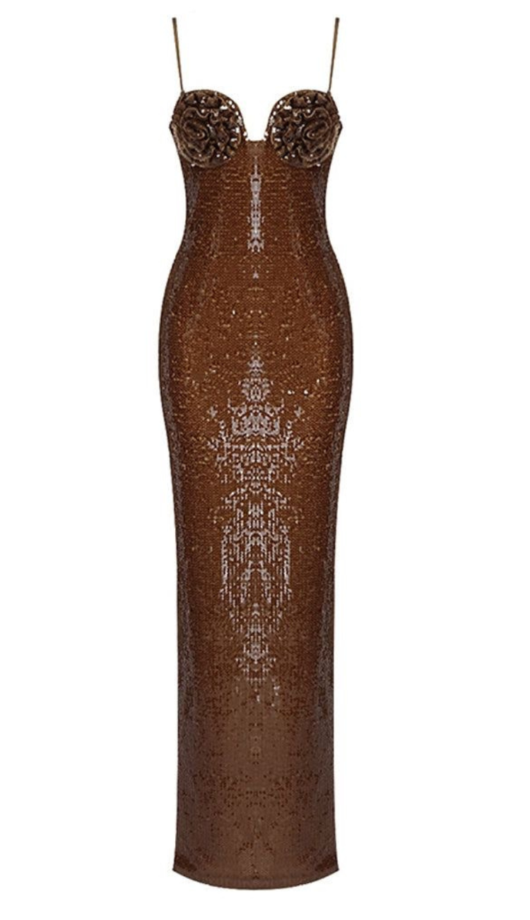 - Thin spaghetti straps, soft v-cut, ruching and brocade details on rose shaped cups.