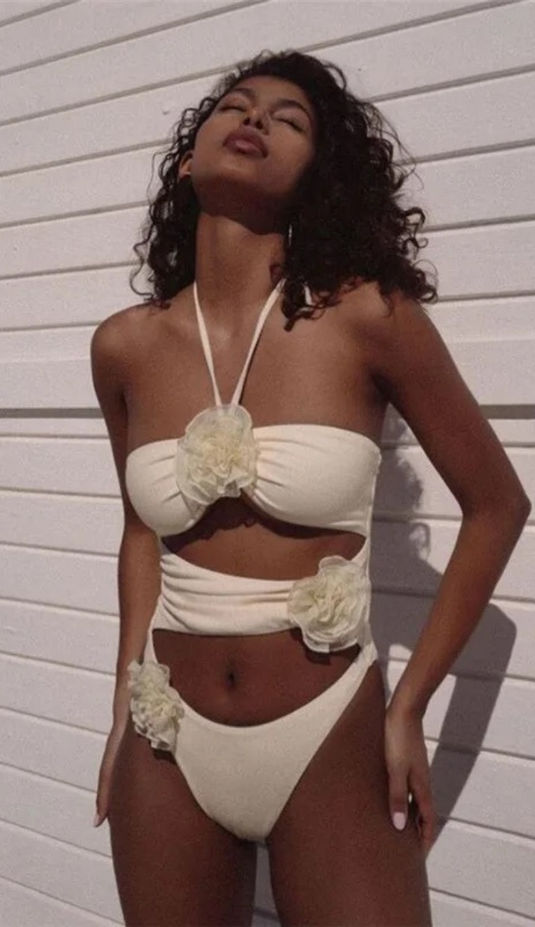 Introducing the Izara Onepiece – where style and versatility meet. Crafted from a luxurious blend of cotton and spandex, the Izara fuses a cut-out waist design, a halter neckline, and 3D semi-sheer flower embellishments to create a timeless look. Instantly upgrade your swimwear wardrobe and use this one-piece as a swimsuit or bodysuit - two chic options to style it however you like.