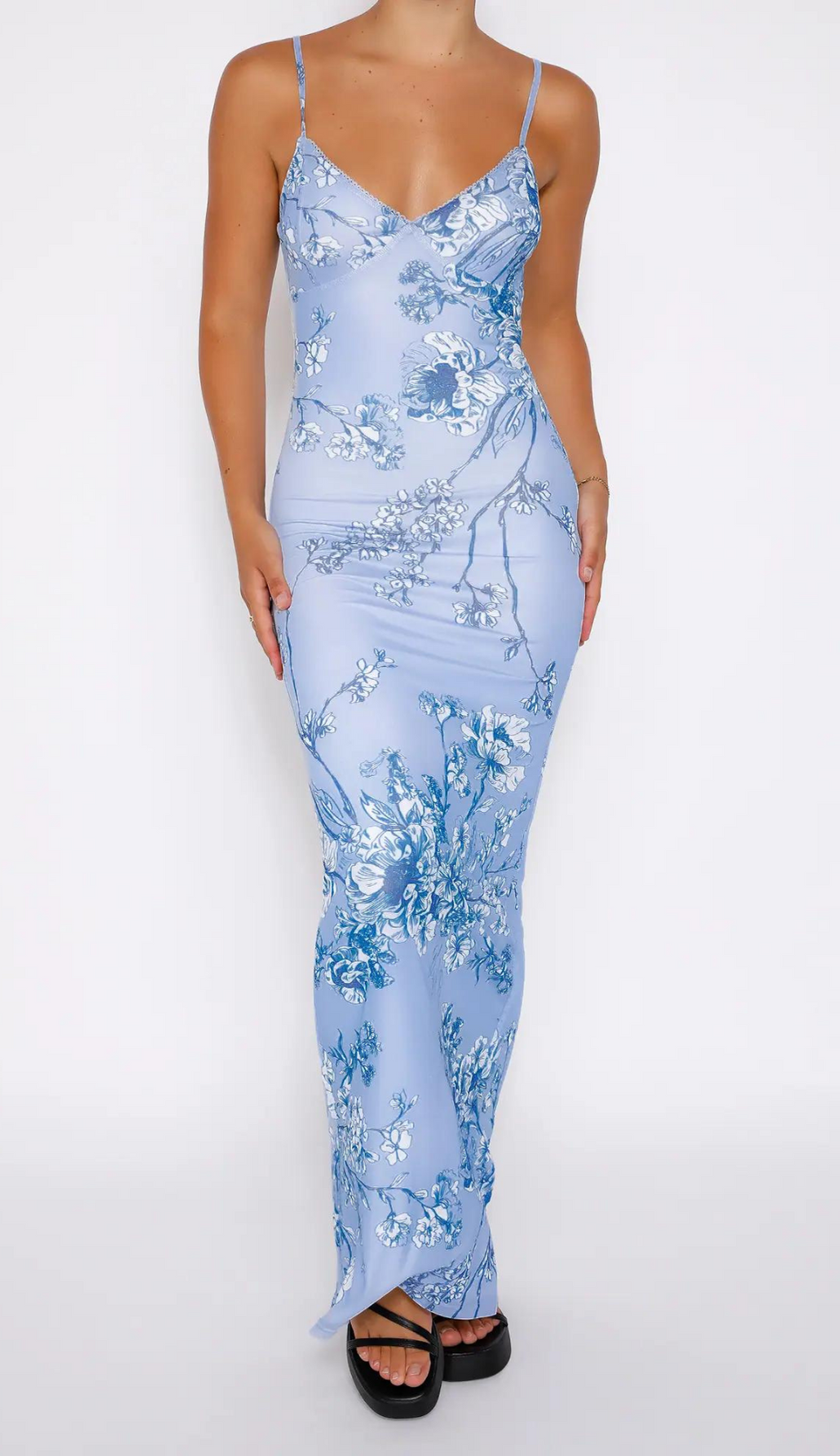Karolina features an all-over ceramic floral print, v-neckline, adjustable spaghetti straps, eyelet trim detail at the edge, slip in, fully lined (not sheer) made of 92% polyester 8% elastane