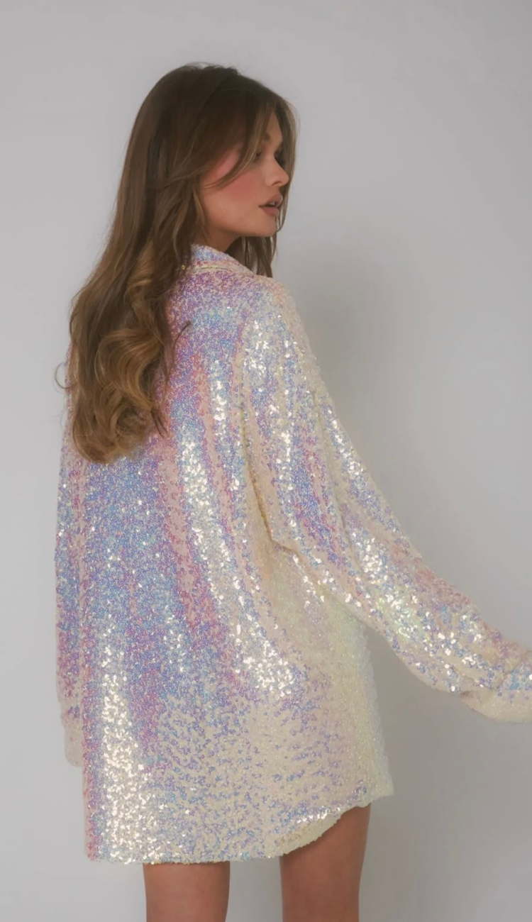 Solid sequin fabric, invisible button details, front pockets. A-line cut, relaxed style.