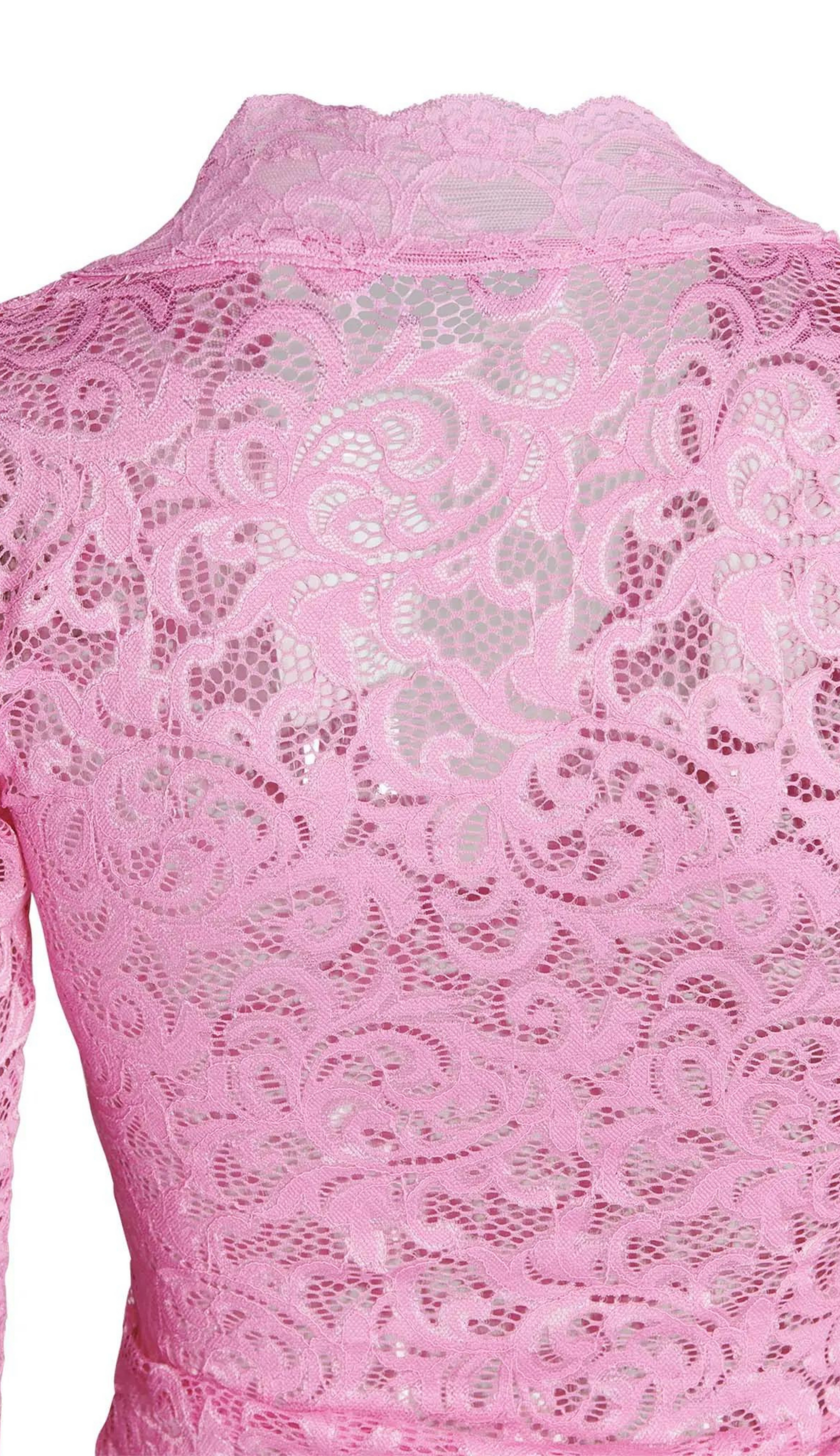 The Martinique Blouse is the epitome of feminine grace. This top is adorned with an all-over pink lace fabrication and contrast lace scallop detailing. Additionally, long flare sleeves with an opening at the hemline add a touch of alluring refinement. Perfect for both daily and special occasions.