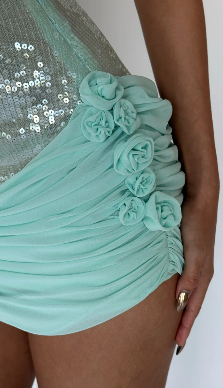 Flirty. Fierce. Unforgettable. Your after-dark statement — a shimmering fusion of elegance and playful romance. Designed in radiant sequins that catch every light, she features delicate spaghetti straps, a sculpted corset bodice with adjustable support, and a draped mini skirt that moves like liquid.