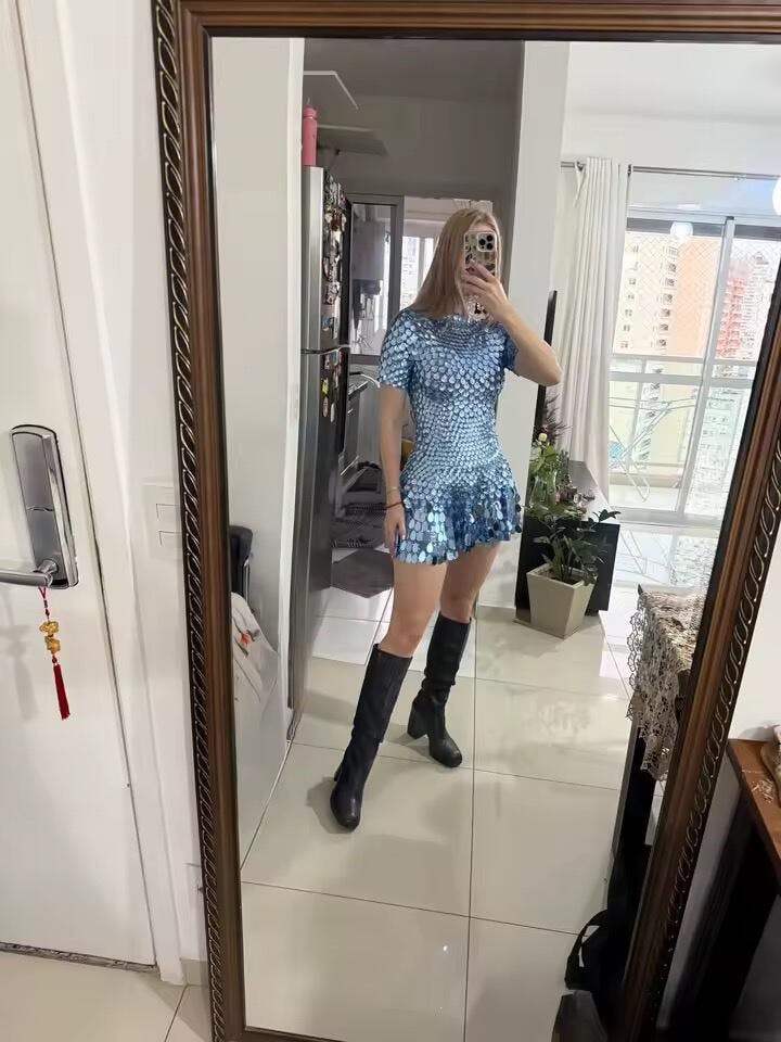 A statement piece designed to captivate. Adorned with hand-glued metallic sequins, this dress shimmers with every movement, creating a radiant, liquid-like glow.
